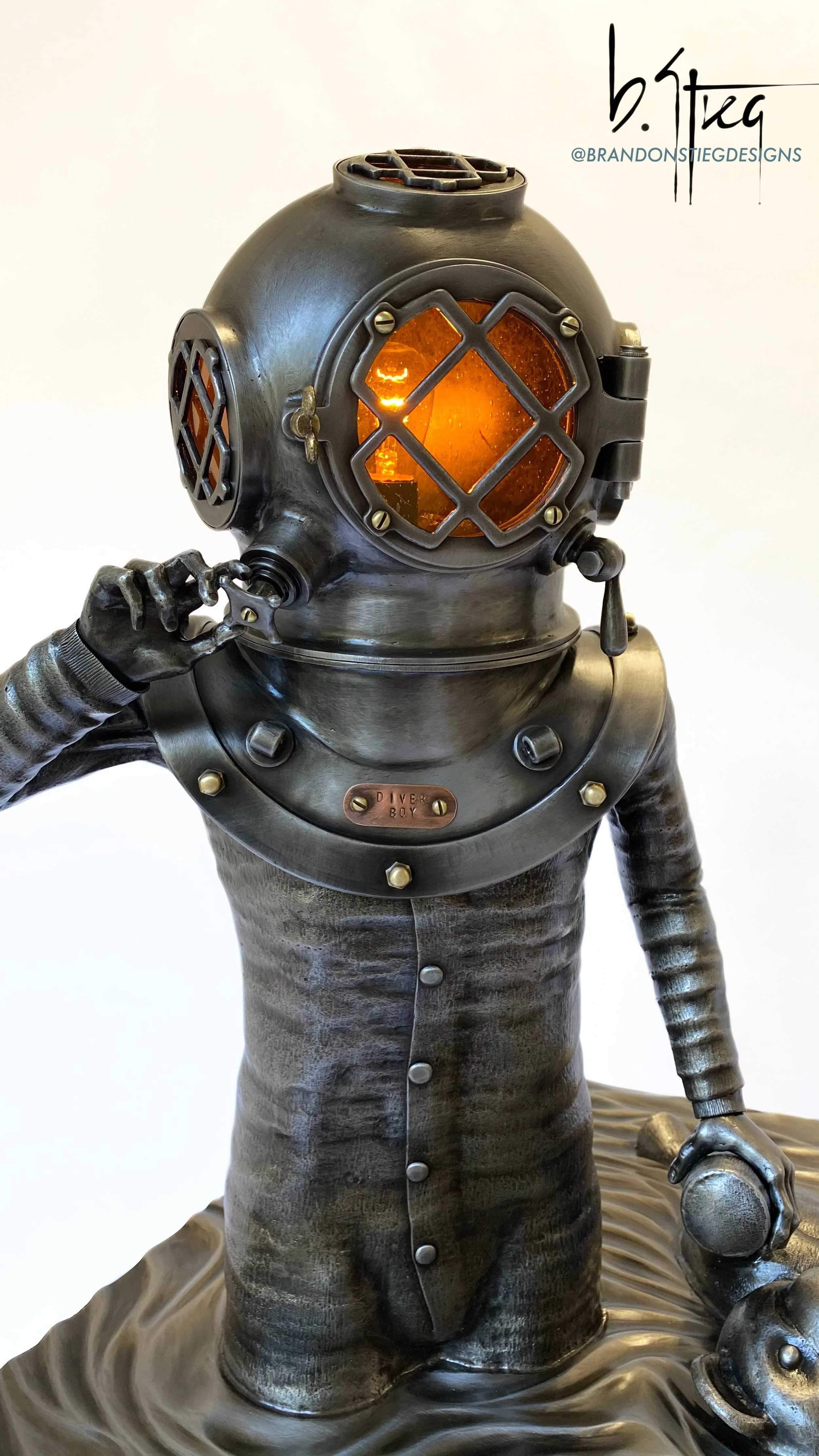 Not a Casting. Diver Boy is the headline sculpture in Brandon Stieg’s Diver Boy series and is entirely hand-forged, formed, and fabricated in steel, brass, bronze, and copper. Standing approximately 5 feet tall with the base and 24” wide, the piece is built over a welded steel framework and clad with meticulously hand-carved and textured metal panels. The helmet features an operational front hatch and is fitted with an Edison bulb. The steel base is carved in a flowing water pattern. One of a kind.