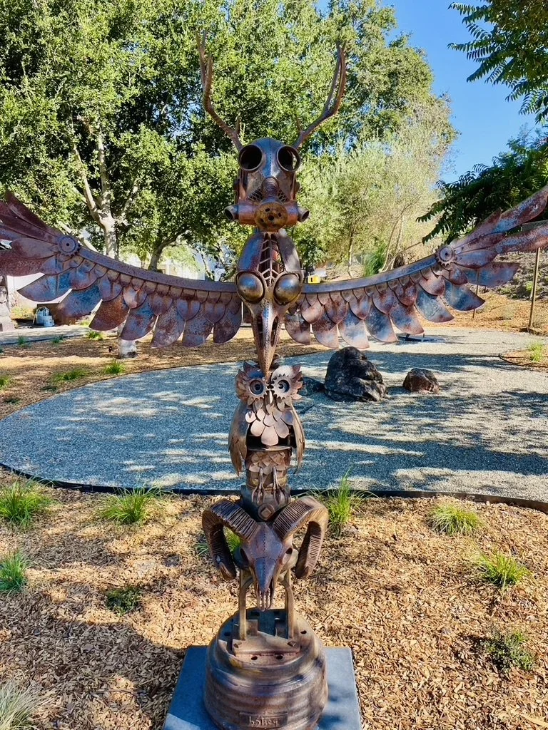 Created during California’s fire season and the electrical storms that swept the state, Fire Totem is a one-of-a-kind sculpture by Brandon Stieg, standing approximately 8 feet tall with a 7-foot wingspan. Hand-forged, formed, and fabricated in welded steel, the piece incorporates raw materials and found relics—remnants of our industrial past. Totemic figures including a ram’s skull, owl, raven, hawk, deer, and a retro gas mask are crafted through intensive metalwork and arranged in a vertical composition that reflects on destruction, survival, and the enduring spirit of the natural world.