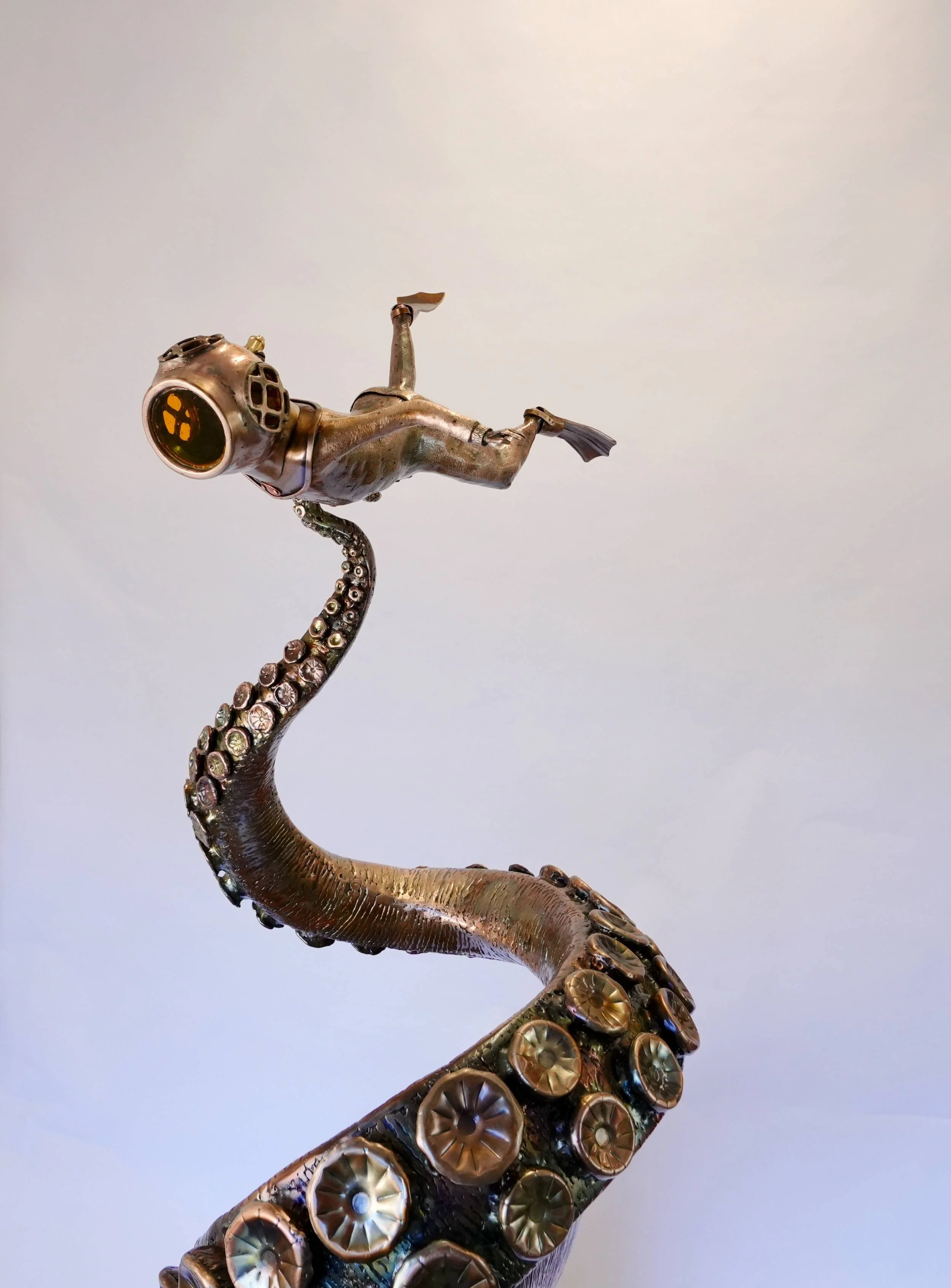 Brandon Stieg’s newest addition to the Child Series, Rise, is a hand-forged sculpture standing over 7 feet tall. It explores the trials of youth and the journey through fear, courage, and transformation. Inspired by his role as both artist and father, the piece depicts a young boy facing oversized challenges—like a Kraken—symbolizing resilience in the face of adversity. Through Rise, Stieg invites viewers to reflect on their own journeys, ultimately celebrating the transformative beauty of becoming and the healing power of creation. One of a kind.